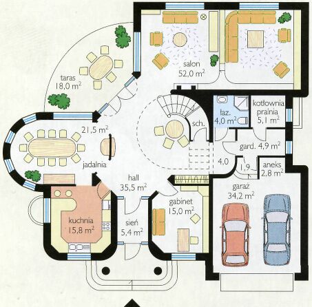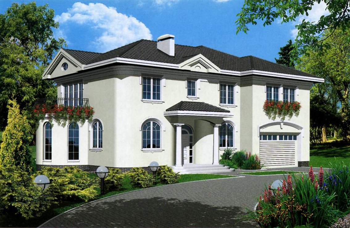 | Elegancki, reprezentacyjny, przestronny i funkcjonalny, wolno stojący dom mieszkalny, z garażem na dwa samochody. Został zaprojektowany w postaci piętrowej, stylowej willi. Jeżeli warunki nasłonecznienia na działce tego wymagają można zawsze realizować budynek w odbiciu lustrzanym. Istnieje wersja z podpiwniczeniem. Pokój bilardowy można przeznaczyć na apartament gościnny z matą łazienką i garderobą. Nad tarasem można wykonać głębsze zadaszenie lub dobudować oranżerię. Propozycje