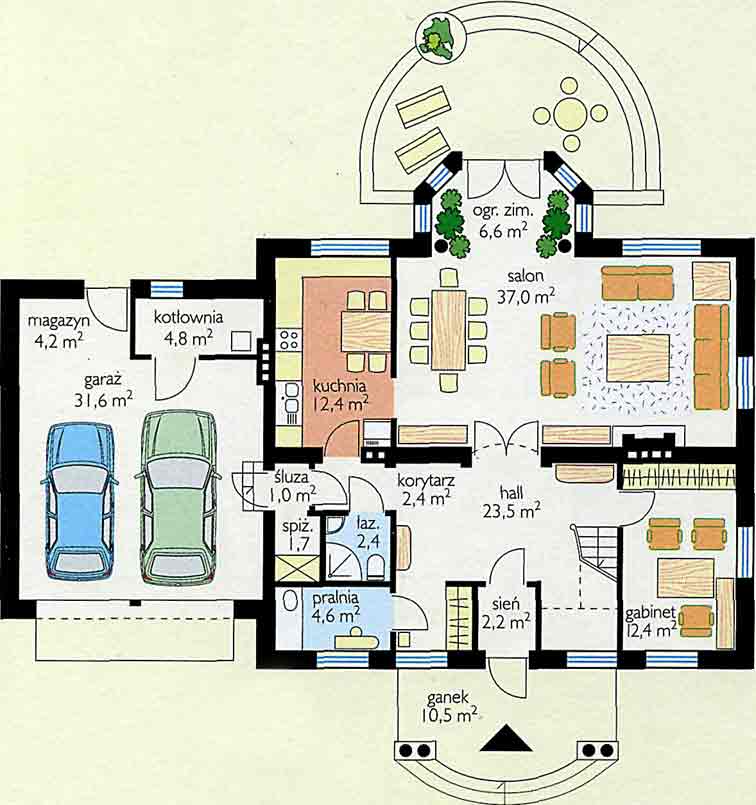 Stylowy, wolno stojący dom jednorodzinny, z użytkowym poddaszem, z przybudowanym garażem na dwa samochody. Bardzo przestronny, funkcjonalny i tatwy w realizacji. Budynek zostat zaprojektowany w zwartej bryle, na rzucie prostokąta, z centralnie usytuowanym wejściem. Część mieszkalna zostata umieszczona na poddaszu, parter stanowi przestrzeń ogólnoużytkową. Istnieje możliwość podpiwniczenia oraz dowolnego zagospodarowania poddasza wg wtasnych potrzeb. Jeżeli warunki nasłonecznienia na działce tego wymagają, budynek można zrealizować w wersji lustrzanego odbicia. Propozycje rozwiązań