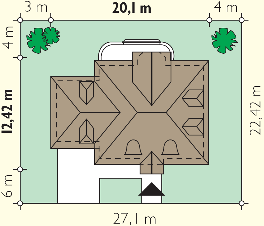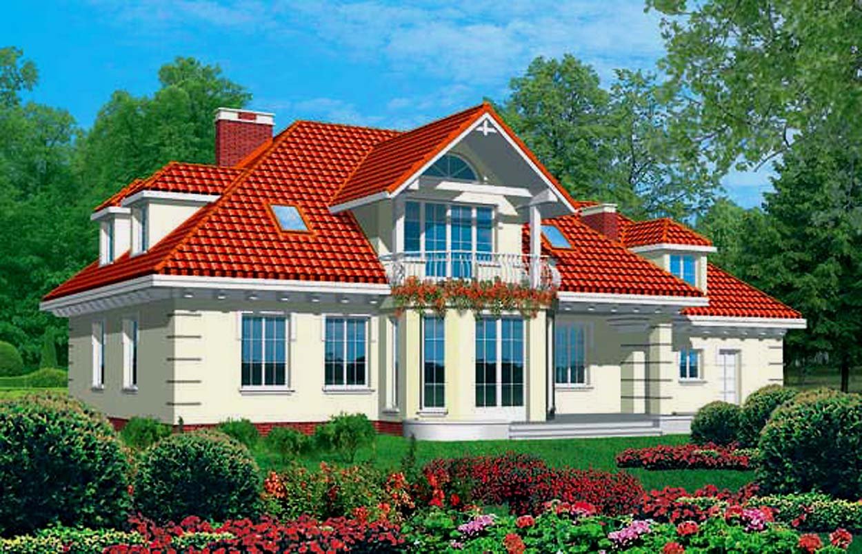 | Stylowy, wolno stojący dom jednorodzinny, z użytkowym poddaszem, z przybudowanym garażem na dwa samochody, bez podpiwniczenia lub z częściowym i pełnym podpiwniczeniem. Poddasze można dowolnie zaaranżować. Bardzo przestronny, funkcjonalny i łatwy w realizacji. Od strony ogrodu na poddaszu zaprojektowano obszerny, zadaszony taras nad ogrodem zimowym. Propozycje
