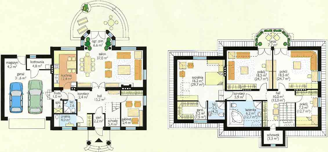 | Stylowy, wolno stojący dom jednorodzinny, z użytkowym poddaszem, z przybudowanym garażem na dwa samochody, bez podpiwniczenia. (Istnieje wersja i częściowym i całkowitym podpiwniczeniem.) Bardzo przestronny, funkcjonalny i tatwy w realizacji. Budynek został zaprojektowany w zwartej bryle, na rzucie prostokąta, z centralnie usytuowanym wejściem w postaci tradycyjnego ganka. Część mieszkalna została umieszczona na poddaszu, parter stanowi przestrzeń ogólnoużytkową. Od strony ogrodu, na poddaszu, zaprojektowano obszerny, zadaszony taras nad wykuszem ogrodu zimowego. Istnieje możliwość dowolnego zagospodarowania poddasza wg własnych potrzeb, jeżeli warunki nasłonecznienia na działce tego wymagają, budynek można zrealizować w wersji lustrzanego odbicia. Propozycje