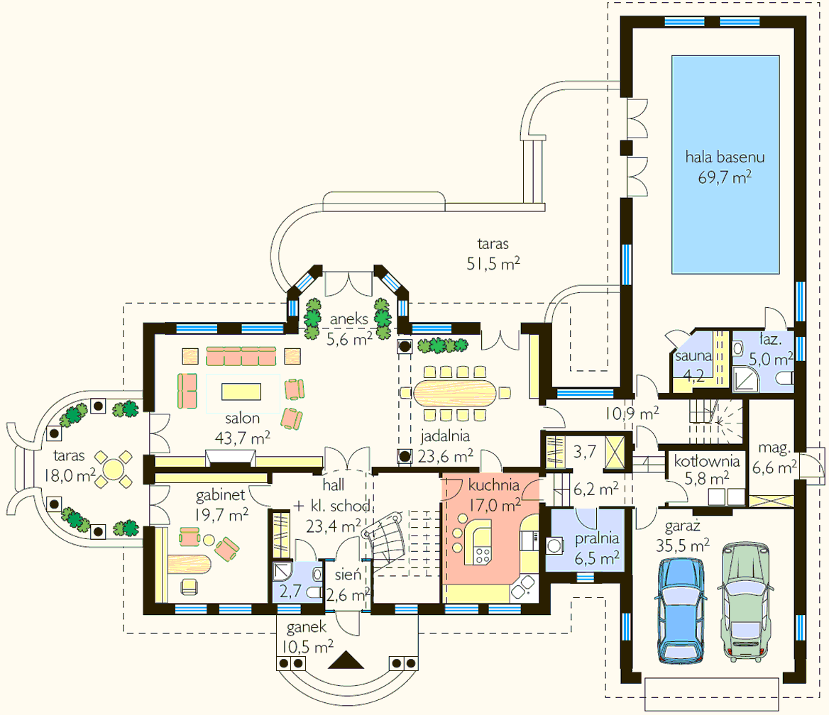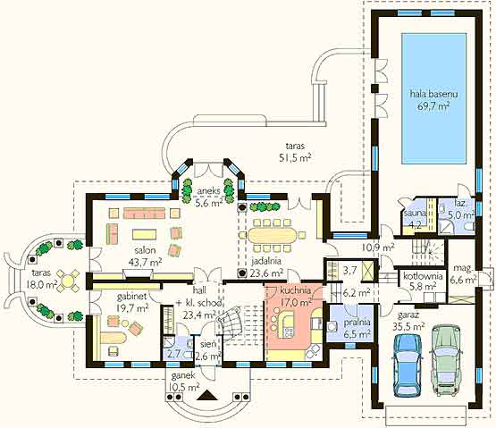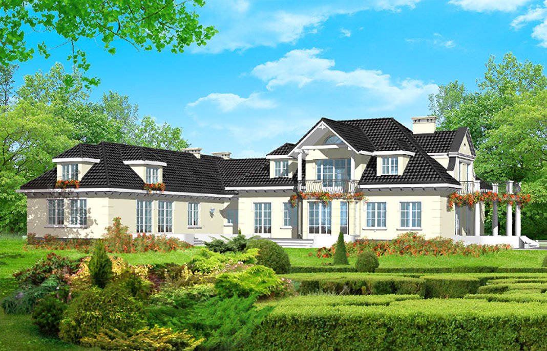 dworku, z użytkowym poddaszem, basenem i garażem na dwa samochody.