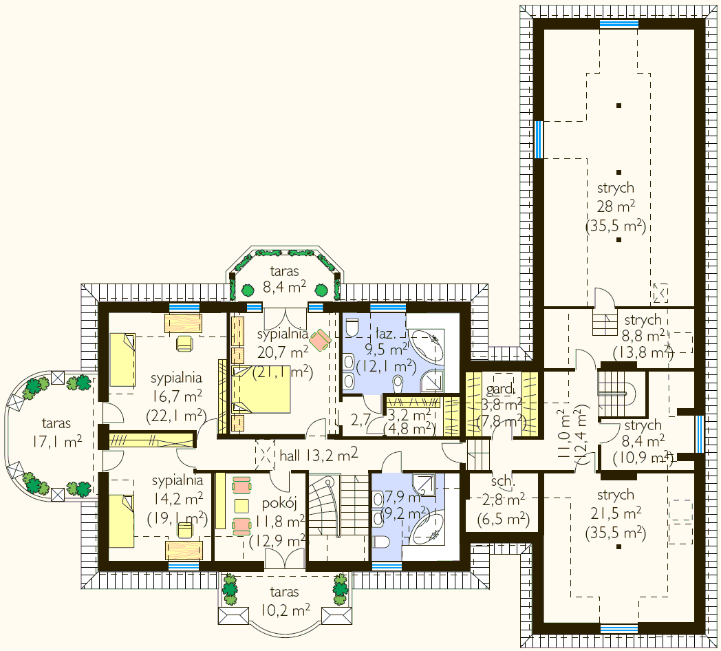 poddasze: 99,90 m2 (w nawiasach podano pow. podłogi) | ||||||