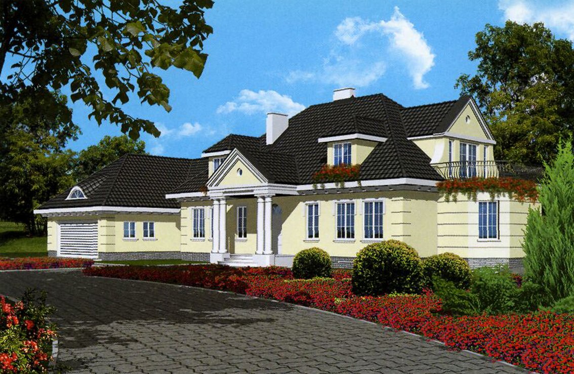 | Elegancki, stylowy, wolno stojący dom mieszkalny, z użytkowym poddaszem i przybudowanym garażem na dwa samochody. Dom jest przeznaczony dla rodziny wielopokoleniowej. Poddasze można adaptować na samodzielne mieszkanie. Przewidziana jest dobudowa basenu w skrzydle za garażem. Istnieje wersja z podpiwniczeniem i w odbiciu lustrzanym z basenem. Propozycje