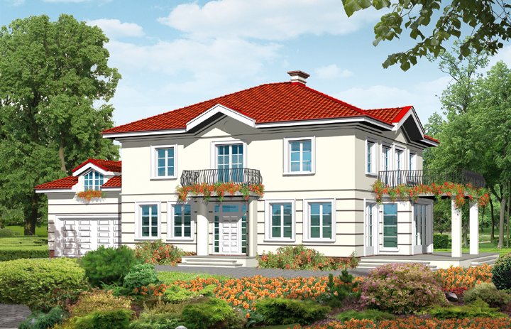 Elegancki, wolno stojący, piętrowy dom jednorodzinny, z przybudowanym garażem na dwa samochody. Wygodny, przestronny, funkcjonalny i łatwy w realizacji. Budynek posiada taras z podcieniem na parterze oraz taras i balkon na piętrze. Istnieje możliwość podpiwniczenia. Dostępne lustrzane odbicie projektu szczególnie polecane dla dziatek z wjazdem od południa. Wysokość budynku - 9,73 m. Powierzchnia zabudowy - 218,7 m2. Propozycje