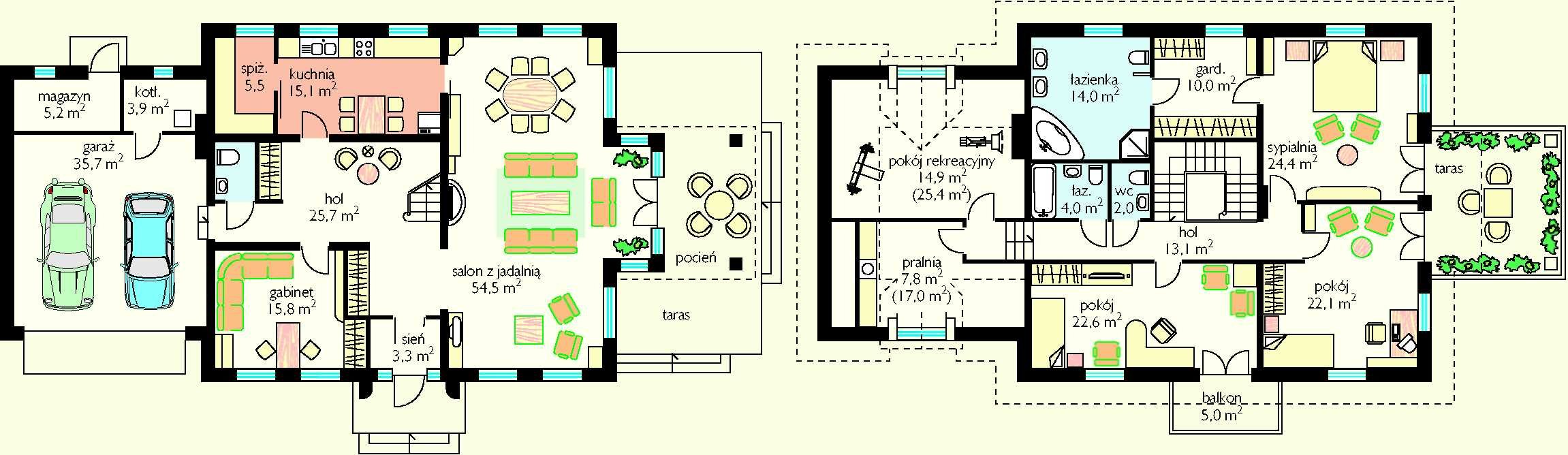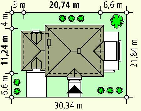 266,1 m2 + garaż 35,7 m2 minimalne wymiary działki: 30,34 x 21,84 m |