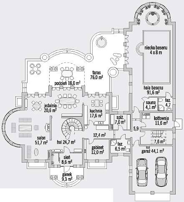 Powierzchnie: użytkowa 646,3 m2 + garaż 44,1 m2;