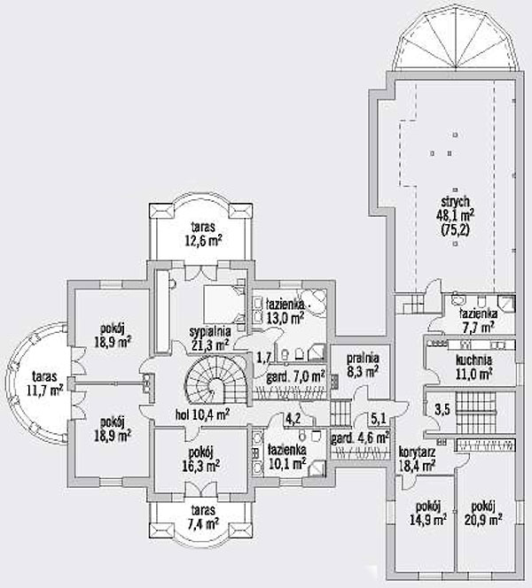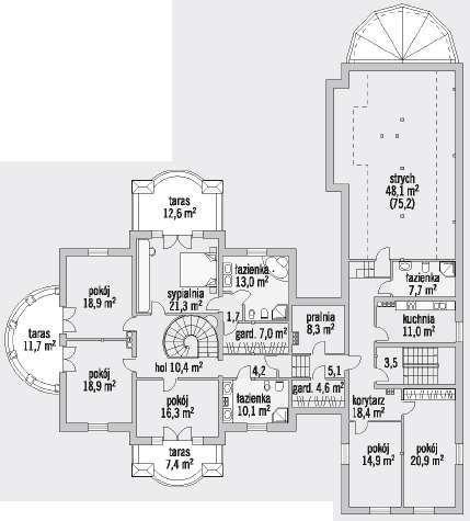 Piętro stanowi strefę prywatną właścicieli. Obok sypialni z wyjściem na taras i dwóch łazienek z garderobami ulokowano tu również trzy pokoje. Nad garażem dodatkowo powstały dwa pomieszczenia gościnne z kuchnią i łazienką, zaś nad halą basenu umieszczono strych nieużytkowy, na którym można zainstalować urządzenia wentylacji mechanicznej dla basenu. Projekt: Klaudyna V z basenem