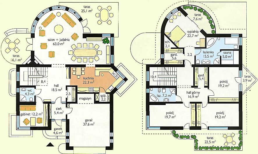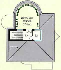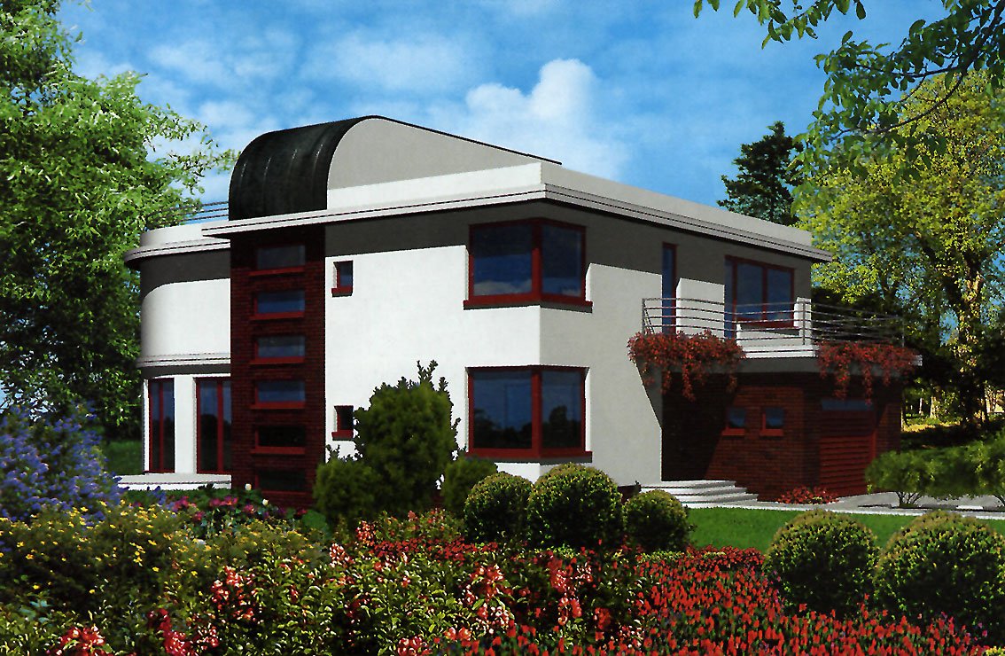 | Wolno stojący, jednorodzinny dom mieszkalny, z wbudowanym garażem na 2 samochody. Przestronny i funkcjonalny. Budynek piętrowy, częściowo podpiwniczony, z fragmentem poddasza stanowiącym wyjście na solarium nad piętrem. Posiada tarasy nad częścią parteru i nad piętrem, które mogą być pokryte naturalną roślinnością. Na poziomie terenu zaprojektowano tarasy ziemne łączące się z ogrodem. Dostępna wersja bez podpiwniczenia. Propozycje