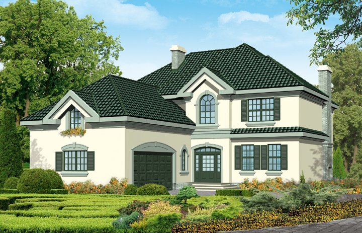 wolno stojący, piętrowy dom jednorodzinny, z przybudowanym garażem