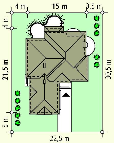 269,0 m2 + garaż 37,7 m2 minimalne wymiary działki: 22,5 x 30,5 m |