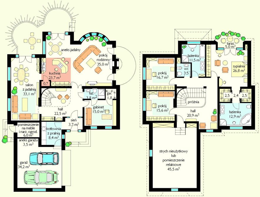na dwa samochody. Wygodny, przestronny, o ciekawym układzie funkcjonalnym.