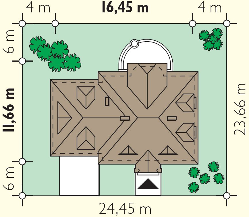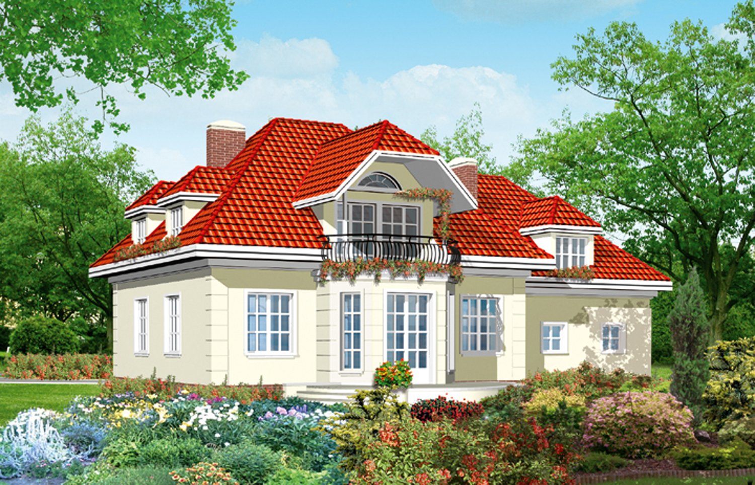 | Mały, stylowy dom jednorodzinny, parterowy, z użytkowym poddaszem. Bardzo funkcjonalny, przestronny, zaprojektowany w stylu tradycyjnego polskiego dworku. Posiada wejście w postaci ganka z kolumnami oraz zadaszony taras na piętrze od strony ogrodu. Łatwy i tani w realizacji. Istnieje wersja w odbiciu lustrzanym i wariant z podpiwniczeniem. Dostępna wersja z garażem na jeden samochód oraz mniejszym prostokątnym wykuszem. Wysokość domu 8,8 m. Propozycje